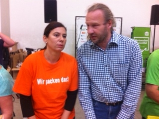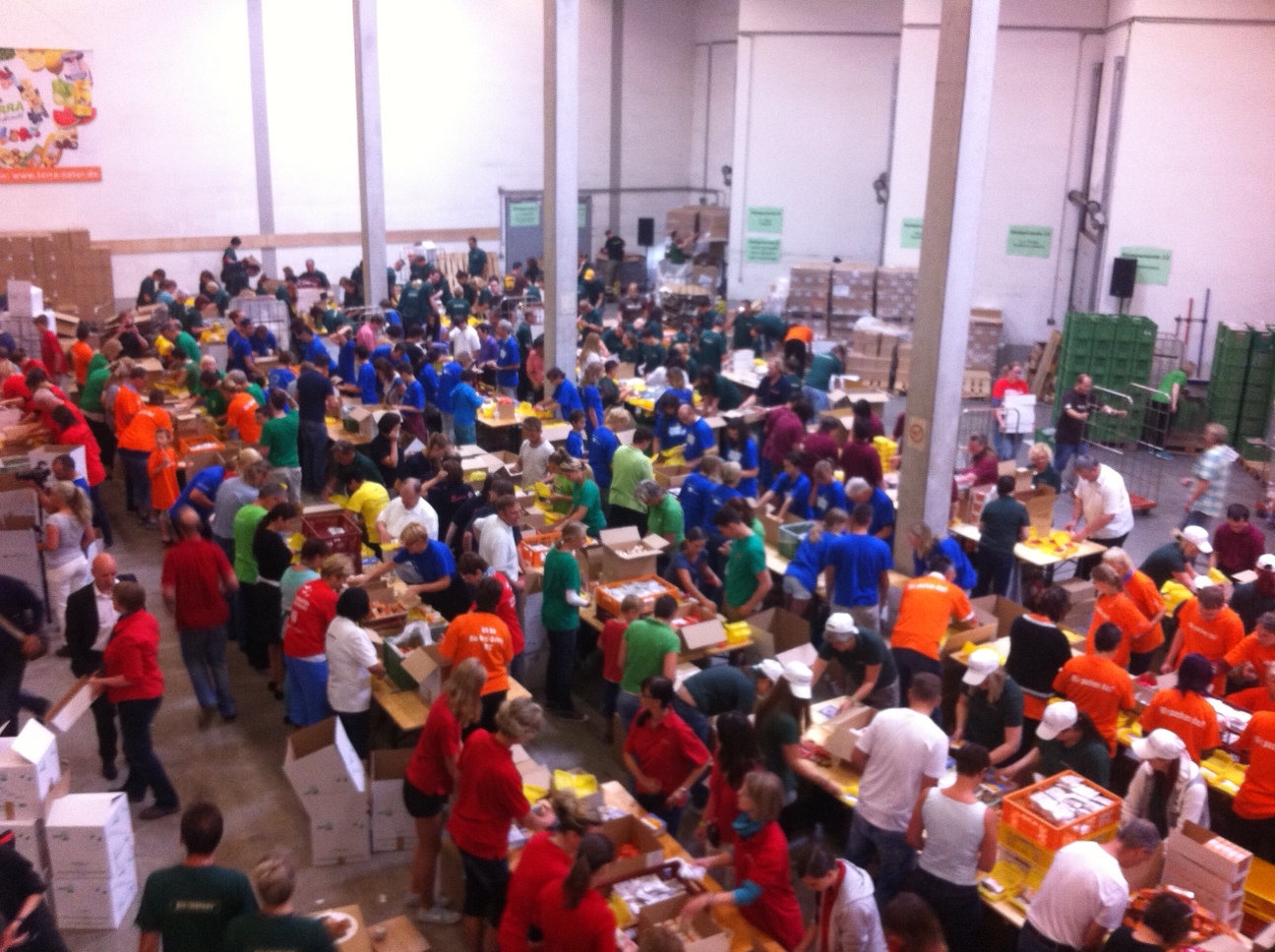 Damit die 53.000 Erstklässler an 1000 Grundschulen in Berlin und Brandenburg zu ihrem Schulstart in der Pause etwas Gesundes zu essen haben, wurde am heutigen Sonntag auch von Prominenten Hand angelegt. Zum traditionellen Packaktion der Bio-Brotboxen (31.000 für Berlin, 21.000 für Brandenburg) waren Bildungssenatorin Sandra Scheeres gemeinsam mit Verbraucherschutz-Staatsekretärin Toepfer-Kataw und Brandenburgs Bildungsministerin Dr. Martina Münch sowie der früheren Landwirtschaftsministeron Renate Künast zum Bio-Großhandelsunternehmen Terra Naturkost in die Gradestraße gekommen. Zusammen mit an die 500 Freiwilligen füllten sie die gelben Plastik-Boxen jeweils mit einer Scheibe Brot von regionalen Vollkornbäckereien, Möhren und Käseecken, Amaranth-Poppies, Weinbeeren, Kindertee und Fruchtsaft.