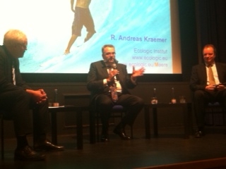 Prof. R. Andreas Kraemer, Gründer und Direktor des Ecologic Instituts, gab anschließend einen Überblick über die globale Verschmutzung der Meere und die Auswirkungen auf das vielfältige Leben im Wasser. Zentrales Problem der Kunststoff-Produkte ist ihre Unverrottbarkeit. Eine Plastikflasche kann 450 Jahre halten, das schafft kein Staat, er Vatikan ausgenommen. Größtes Problem ist die weltweite Verbreitung des Plastikmülls und seine Miniaturisierung in kleine Partikel („Plastik-Suppe"), die von der Tierwelt aufgenommen wurde. Kraemer empfahl ein unappetitliches Gourmet-Experiment mit Austern. An erster Stelle sah der Ecologic-Chef die Politik in der Pflicht, gesetzliche Mauern gegen die Plastikflut zu errichten. Auch die Forschung sei gefragt, nach ihren Erfolgen bei unkaputtbaren Polymeren nun einer grünen Chemie zum Durchbruch zu verhelfen, die sich in natürliche Kreisläufe wieder einfügen könne. Und die Verbraucher? Auf jeden Fall die Fleeze-Jacke entsorgen, empfahl Kraemer.